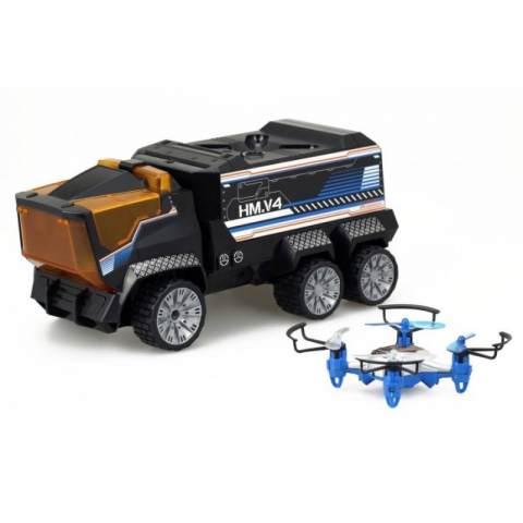 Drón és autó egy szettben Ebben a szettben egy teherautót találsz, aminek a tetején kialakított helyen tudod szállítani a drónt. A távirányítón egy kapcsoló segítségével választhatod ki, hogy melyiket szeretnéd irányítani. A drón egyetlen gombnyomással felszáll és leszáll, kezdők is könnyen tudják irányítani. A követési mód aktiválasa után a drón elkezdi követni az autót. A quadcoptert az USB kábellel lehet tölteni vagy egyszerűen csak le kell szálln