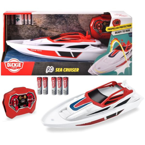 A Dickie: RC Sea Cruiser távirányítós motorcsónak uralja a vizet! Az 1:48 méretarányú RC motorcsónakkal valódi tengerésznek érezheti magát az ember, édes vízben használható, medencében vagy tóban. Tartalmas, izgalmas játékot nyújt a friss levegőn. A csónak propellerhajtású, amire vigyáz a biztonsági kikapcsoló funkció, tehát a csónak csak akkor kezd fordulni, ha az a víz felszínén úszik. A kétcsatornás csónak 2.4 GHz frekvencián kommunikál a távirányít