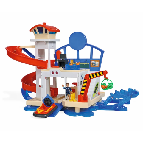 55x35cm méretű Sam a tűzoltó Óceán vizimentő állomás helikopter leszállóval, csúszdával, rejtett lifttel, lenyitható rámpával, daruval és kilőhető légpárnás járművel. A csomagolás egy darab Jodie...