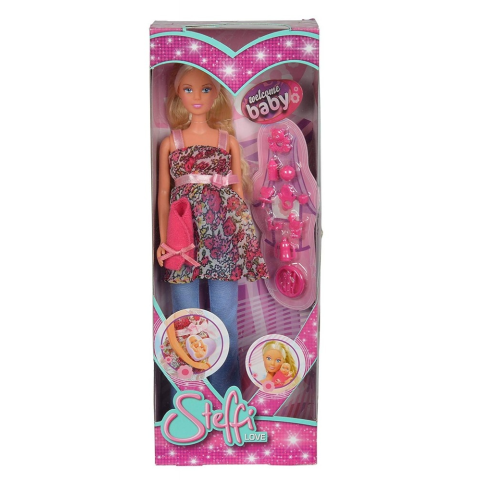 Steffi anyai örömök elé néz, és alig várja, hogy megszülessen a kisbabája. A 29 cm-es játékbaba gömbölyödő pocakkal is elbűvölő, amikor pedig megérkezik a várva várt csöppség, a kislányok a segítségére lehetnek az újszülött gondozásában. Steffi baba haja fésülhető, így mind a várandósság alatt, mind a baba születését követően stílusos frizurával indulhat el sétálni a kisbabájával. A baba terhes pocakja levehető, így a kisbabát könnyen ki lehe