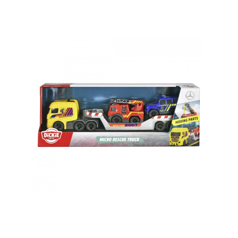 A Micro Rescue Truck mentőautó szett minden kis mentőrajongónak ideális választás, aki szeretné megtapasztalni a vészhelyzeti szolgáltatások izgalmát. A Dickie Toys által tervezett szett egy nagy teherbírású szállító kamionból és két speciális mentőjárműből áll: egy tűzoltóautóból és egy rendőrautóból. A kamion több mint 200 tonnás terhelhetőséget szim