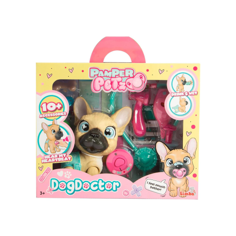 A Pamper Petz Dog Doctor szett tökéletes játék minden állatbarát kisgyerek számára, aki szeretne kis kedvencével törődni és kipróbálni magát állatorvosként. A szett egy cuki kiskutyát tartalmaz, aki gondoskodásra szorul, és több mint 10 különböző kiegészítővel érkezik, így a gyerekek minden szükséges eszközt megtalálnak a "gyógyításhoz". A játék során a kiskuty