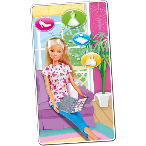 A lányok a legújabb divattrendek szerint alakíthatják és öltöztethetik Steffi babájukat. Steffi a laptopján rendelt magának ruhákat, és most érkezett négy csomag. Már alig várja, hogy felpróbálja a ruhákat. A készlet tartamaz egy Steffi babát nadrágban és