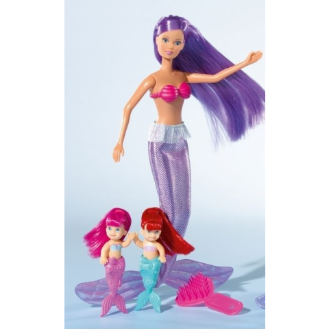 Steffi babával a víz alatti kalandok is felejthetetlenek. Ebben a szuper készletben 3 sellőbaba lehet a gyerekeké, hogy kedves történeteket adjanak elő segítségükkel. Steffi baba ebben a készletben csodás lila frizurát kapott, és a sellőikrek haja is haso