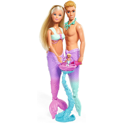 Steffi barbie baba sellő család készlet minden gyermeket elvarázsol. Steffi és Kevin már nagyon várják a kis sellőbaba érkezését. A kagyló alakú kiságy már készen áll a baba születésére. A kiságy levehető az állványról, így babahordozóként is használható.