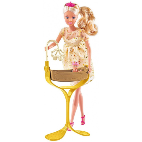 Steffi hercegnő terhes és babát vár. Steffi királyi ruhában és bölcsővel érkezik a gyerekszobába ezzel a készlettel. Amikor a baba megszületik, egy kis koronát is kaphat a fejére. A kisbaba feje, karjai és lábai mozgathatóak. A Steffi