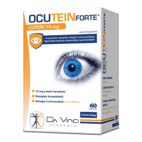 Lutein, zeaxantin, omega-3 zsírsav tartalmú lágyzselatin kapszula vitaminokkal, nyomelemekkel. 15 mg Lutein tartalom Komplex összetételű Omega-3 zsírsavakat is tartalmaz Az OCUTEIN FORTE készítmény 15 mg luteint, többszörösen telítetlen omega-