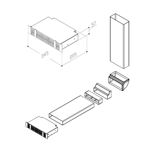 1 db S-KFHE3 feketére festett doboz (ház)1 db HP55 nagy teljesítményű szénszűrő1 db Rozsdamentes acél rács1 db Lapos csatorna 220x90 mm, hossza: 610 mm1 db Lapos csatorna csatlakozó toldó 220x55 mm1 db Átalakító adapter 220x90 mm-ről 220x55 mm-re1 db 90°-os könyök la