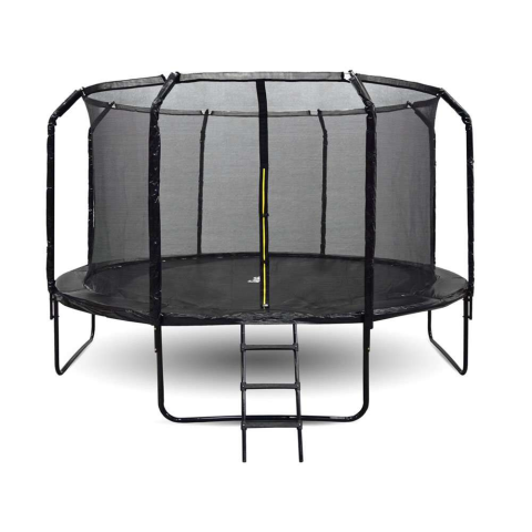 1 kép Skyflyer fekete, 366 cm-es kerti trambulin hálóval és profilozott oszlopokkal