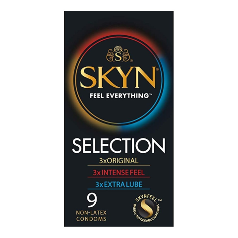 A csomagban 3 különböző típusú óvszer található. Original, pöttyözött felületű és extrán síkosított, mindegyikből 3 db. A Skyn óvszerek speciális, poliizoprén anyagból készülnek, ez a különleges anyag a Skynfeel® fantázianévre hallgat. 100% latex men