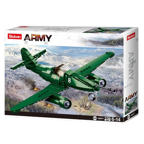334 darabos Sluban Army WWII Budapest ostroma: Me-262 gázturbinás sugárhajtóműves vadászgép építőjáték készlet 1 figurával. Az összeépített repülő 34 cm-es. Ez a különleges készlet része az új Slubban WWII Budapest ostroma szériának amely a magyar főváros