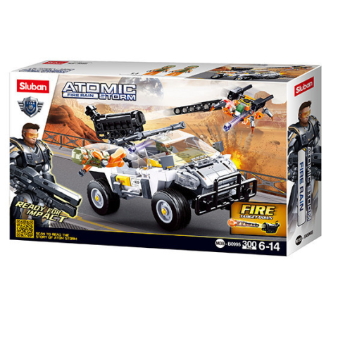 Ebből a Sluban Atomic Storm építőjáték készletből egy felvegyverzett terepjáró építhető össze. A terepjáró utasai fontos küldetésen vannak, ám útjukat félbe szakítják egy ellenséges drón támadása. A terepjáróra hátuljára szerelt puska segítségével kell me