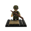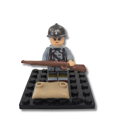 Katonai építőjáték figura műanyag vitrinben. Világháborús francia katona építőjáték figura csomag kiegészítőkkel (1 db fegyver, 1 db homokzsák). A figura a szett tartozékát képező kis építőjáték alaplapra állítható, melyre egy víztiszta műanyag vitrin ill