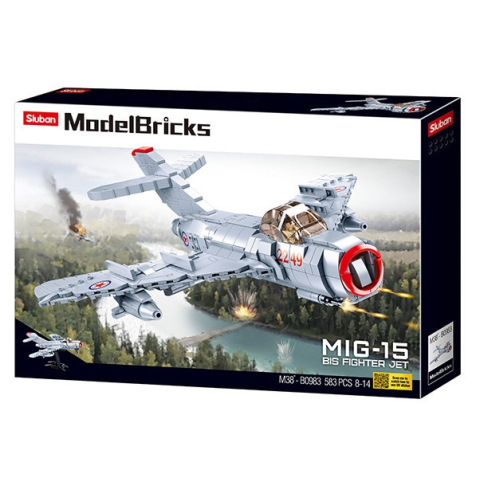 583 darabos Sluban Model Bricks Army MiG sugárhajtású vadászrepülőgép amely összeépítve 30 cm-es építőjáték A 583 építőelemből áll, 1 figurát és ajándék elemszétválasztót is tartalmaz. A repülő részletesen kidolgozott és mind játékként mind díszként (a ké