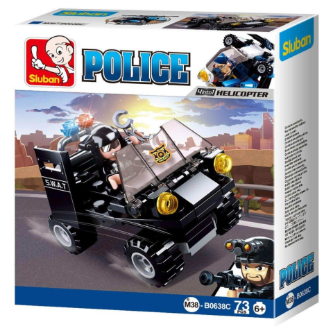 73 darabos Sluban Police - 4 into 1 SWAT terepjáró építőjáték készlet 1 figurával. A Sluban Police 4 into 1 építőjáték készletekkel különböző rendőrségi járművek építhetők össze, ráadásul, ha összegyűjtötted mind a 4-et egy különleges rendőrségi helikopte