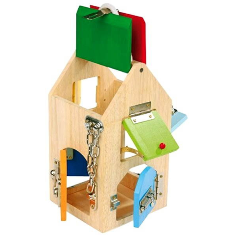Motorikus készségfejlesztő játék - alkalmas gyerekeknek 3 éves kortól A szórakoztató, fából készült, zárakkal ellátott Motorikus ház 3 éves kortól alkalmas. A játékban a gyerekek fejlesztik a motoros készségeket és a térbeli gondolkodást. A ház különböző zárakkal, lánco