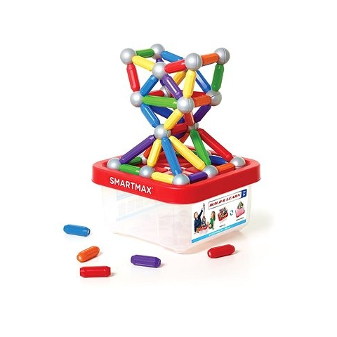 Építőjáték - 100 darabos készlet, téma formák, anyaga műanyag, mágnes és fém, ajánlott 1 éves kortól A legnagyobb SmartMax Build & Learn építőkészlet egy praktikus műanyag tárolóban található, profilozott aljjal és fedéllel, amelyek ideális építőalapként is szolgálhatnak. A készlet 100 színes ele