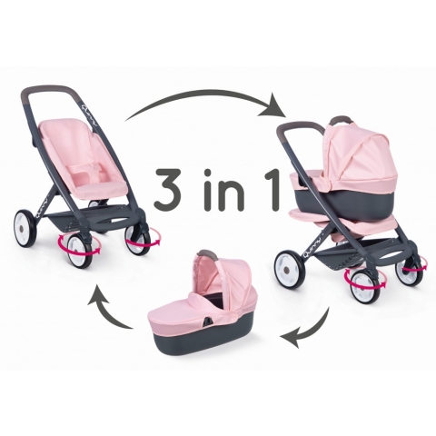 A Smoby Maxi Cosi & Quinny 3 az 1-ben babakocsi egy sokoldalú játék, ami nélkülözhetetlen a gyerekszobából. Használható fekvő babakocsiként, de a mózeskosarat ki is vehetjük a keretből és a tetején található fogantyú segítségével bárhová könnyedén magunkk