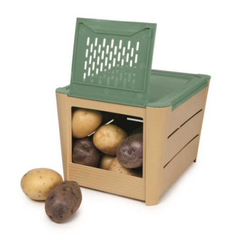 Praktikus tároló rekesz krumpli, hagyma, vösöhagyma és egyéb zöldségek tárolásához. Sötét és jól szellőző. Egymásra helyezhető kialakítás. Körülbelül 3 kg krumpli vagy zöldség tárolására alkalmas.