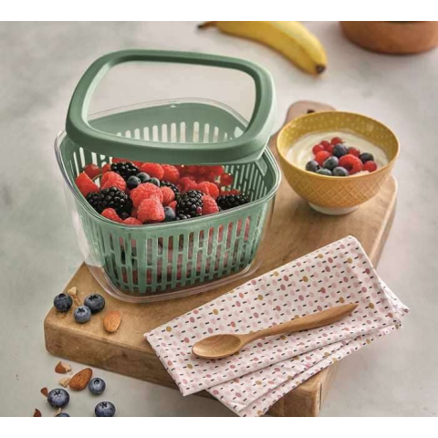 Snips 000766 műanyag tárolódoboz, 1,5 literes kapacitással, kivehető zöld kosárral. Tökéletes egész, vagy vágott zöldségek, gyümölcsök tárolására, mosására.