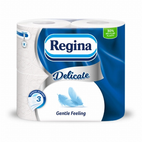 OrszágCountry of Origin: HungaryTárolási típusTípus: SzobahőmérsékletűCsomagolási típusType: BagSzabványosított márkaMárka: ReginaCsomagolás anyagára vonatkozó jelölésekFoil: 4 - LDPEDarabszámEgységek száma: 4AlmárkaAlmárka: DelicateTerméknév felosztásFunkcionális név: ToalettpapírVariáns: Gentle Feeling, 3 rétegűBeszállító által megadott méretekPolcmagasság: 190Polcszélesség: 224Polcmélység: 112Beszállító által megadott súlyBruttó tömeg: 346Bes