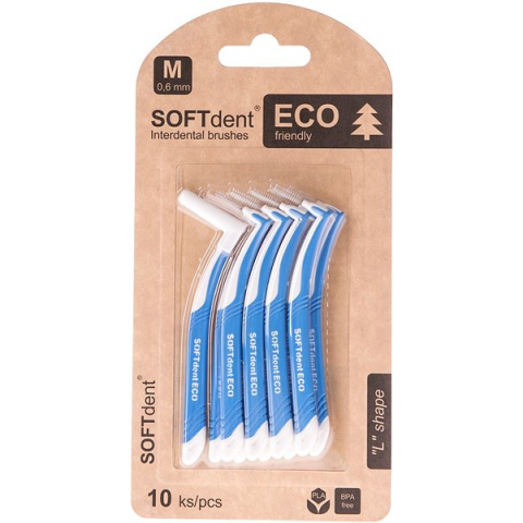 Fogköztisztító kefe - ISO méret 0 (0 - 0,6 mm), drót átmérője 0,6 mm környezetbarát, kék és fehér kivitel, 10 darabos csomag A SOFTdent fogköztisztító kefe tökéletes megoldás a fogak közötti területek tisztítására, ahol gyakran ételmaradékok maradnak. L alakú kialakításának köszönhetően hatékonyan tisztítja és távolítja el