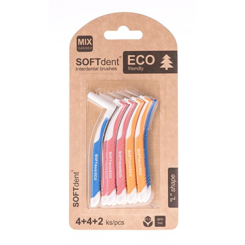 Fogköztisztító kefe - hosszított, ISO méret 1 (0,7 - 0,8 mm), alkalmas 0,7 - 2,5 mm méretű fogközökhöz, drót átmérője 0,7 mm, sörték átmérője 0,7 mm, hagyományos szálak, rózsaszín, narancssárga és kék kivitel, 10 darabos csomag A SOFTdent fogköztisztító kefe tökéletes megoldás a fogak közötti tér tisztítására, ahol gyakran ételmaradékok maradnak. L-alakú kialakításának köszönhetően hatékonyan tisztítja és távolítja el az éte