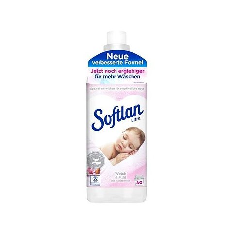 Öblítő - normál mosáshoz, lágyítja a ruhákat, könnyíti a vasalást, alkalmas gyerek ruhákhoz, színes, fehér és fekete ruhákhoz, 40 mosás, friss illat, származás Németországból, 1000 ml űrtartalom A Softlan Weich Mild öblítő egyedülálló illatot és puhaságot biztosít a ruháknak, valamint megkönnyíti a vasalást. Kíméletes a bőrhöz, amit bőrgyógyászati tesztek is igazolnak, és gyermekruhákhoz is h
