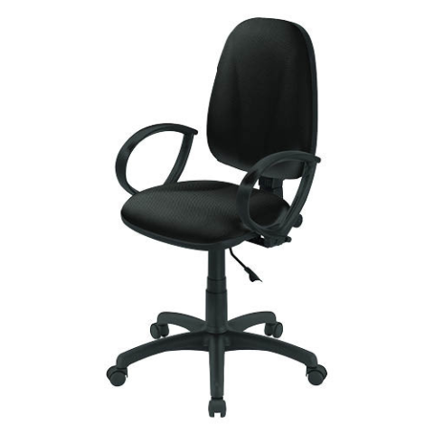 Irodai forgószék nem gyulladó szövet kárpitozású háttámlával és ülőlappal. Fix műanyag karfa. Fokozatmentes ülésmagasság állítás. Önbeálló háttámla, dőlésszög állítás és rögzítés adott pozícióban. Fokozatmentes háttámla magasság állítás. Háttámla mélység