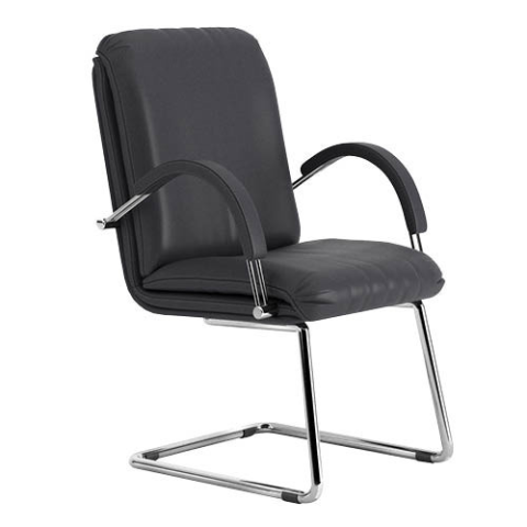 Fekete textilbőr kárpitozású tárgyalószék. Alacsony háttámla. Krómozott fémvázas fix karfa, felső részén fekete színű textilbőr kárpitozású karfapad rátét. Krómozott felületű, fém szánkóváz. A terméket alapesetben dobozban, összeszerelés nélkül szállítjuk