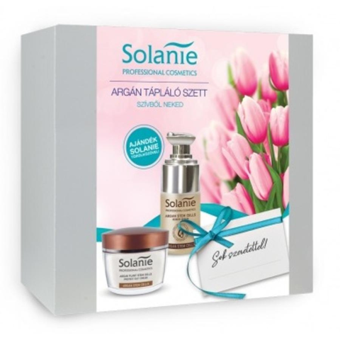 - Az ajándék szettben megtalálható Solanie Argán növényi őssejtes nappali krém és a Solanie Argán növényi őssejtes Renew szérum, együttesen mindazon tápláló összetevőket tartalmaz, melyek makulátlan szépségünk megőrzéséhez szükséges