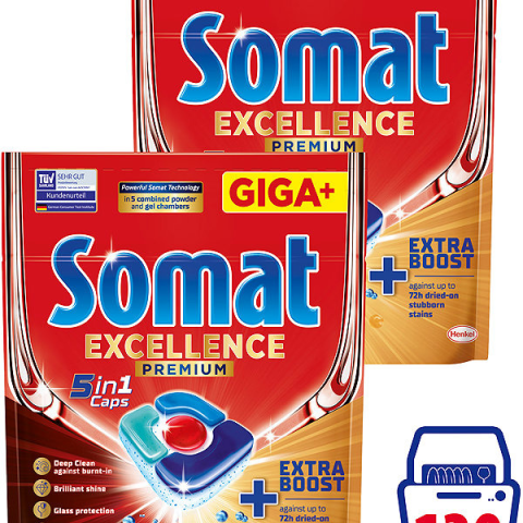 Mosogatógép tabletta - prémium, kombinált, Somat Excellence, 130 db a csomagban A mosogatógép hatalmas segítség a koszos edények elleni harcban. Ha azt kérdezed, hogyan lehetne megkönnyíteni a gépi mosogatást, akkor a megoldás egyszerű. A csomag 130 darab mosogatókapszulát tartal