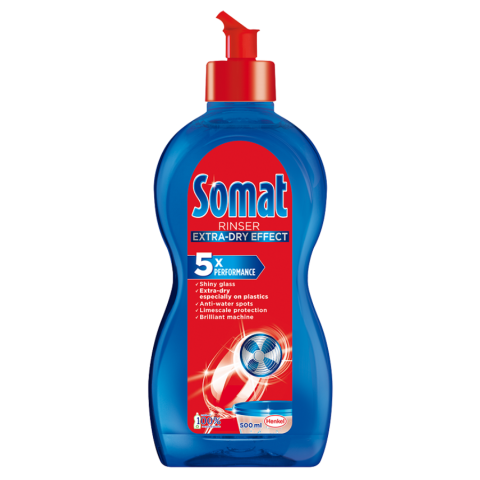 A Somat Extra mosogatógép öblítő ragyogó tisztaságot és gyorsabb száradást biztosít edényei és poharai számára, valamint megelőzi a vízcsepp foltok kialakulását. Száradást gyorsító hatása különösen a műanyag felületeken hatékony. A speciális formulájának köszönhetően edényeinek tökéletes szárazságot kölcsönöz és friss illatot biztosít mosogatógépe számára