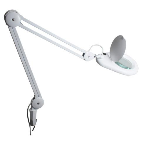 asztallapra szerelhető, hidegfényű (4200 K), 540 lumen fényerő, 125 mm-es nagyítólencse, nagyítás: 3 dioptria, felhajtható, karcolást gátló védőfedél, fejrész mérete: 200 x 40 x 260 mm, a lámpa szárainak hossza: 410 mm (x 2 db), csatlakozókábel hossza: 1,5 m, tápellátás: 230 V~ / 50 Hz / 6,6 W.