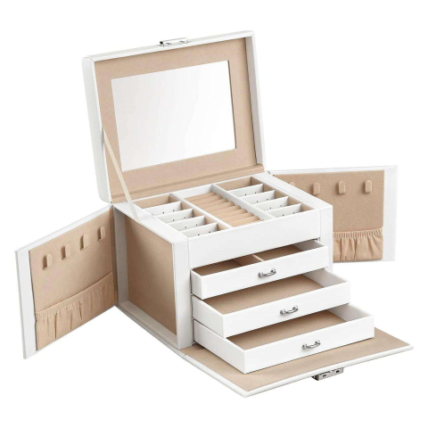 Songmics Ékszerdoboz, ékszerrendező 4 szintes, zárható ékszertartó tálcákkal, bársony bélés, fehér