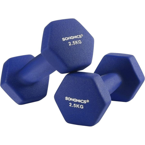SONGMICS súlyzókészlet 2db, súlyzók matt bevonattal neoprénből, csúszásmentes, fitnesz, erősítő edzés, otthonra, edzőterembe[Jól illeszkedik a kézbe] A 11 x 3,7 cm-es (H x Ø) íves nyélnek és a matt neoprén bevonatnak köszönhetően a 2 x 2,5 kg-os súlyzó kényelmes markolattal és csúszásmentes használattal rendelkezik, így nem csúszik ki könnyen a kezedből[Szuper helytakarékos] A nagyobb edzőgépekhez képest a súlyzó rendkívül helytakarékos és könnyen t