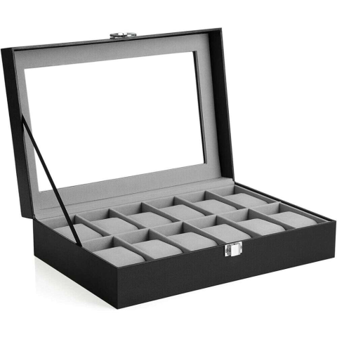 SONGMICS 12 nyílásos óradoboz, óra kijelzőtartó tok, üvegfedéllel, levehető órapárna, bársony bélés, fém kapocs, fekete műbőr, szürke bélés