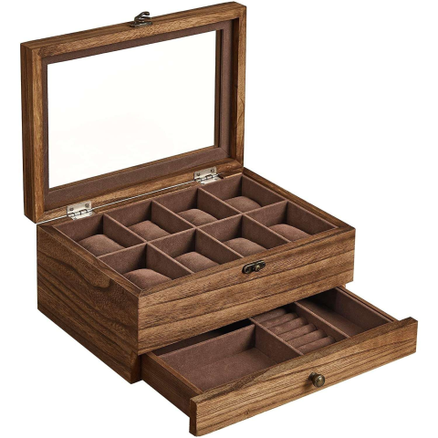 SONGMICS óradoboz akár 8 óra számára, tömörfa óratok párnákkal, ékszerdoboz üvegfedéllel, gyűrűkhöz, karkötőkhöz, nyakláncokhoz,( A képeken látható szín árnyalatokban eltérhet!) rusztikus dió: