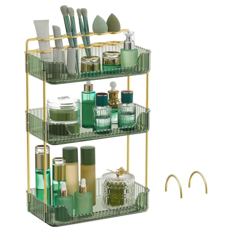 Sminkrendező, 2 féle opcionális kiegészítő, 3 rétegű bőrápoló rendszer, téglalap alakú, személyre szabható, ékszertartó, hiúsághoz, ajándék, halványzöld:[Stílusos és stabil] A bevonatos fémből és kiváló minőségű PET műanyagból készült sminkrendező stílusa és szilárdsága egyaránt büszkélkedhet, ideális megoldást kínálva a fésülködőasztala rendezéséhez.[Tágas, de helytakarékos] A 3 szintes polcok tökéletesek sminkek, szépségápolási esz