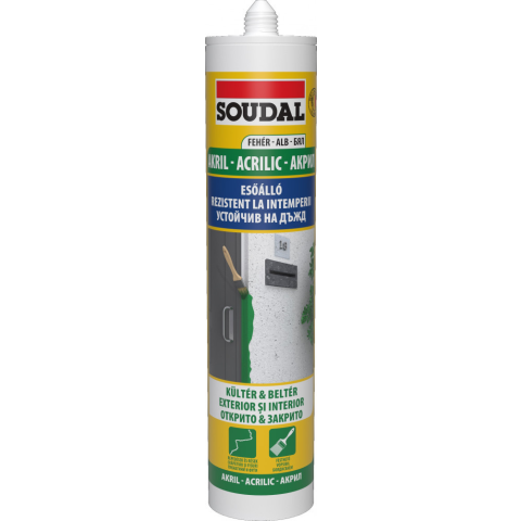 A Soudal Esőálló Akril egy kiváló minőségű, plasztoelasztikus, egykomponensű hézagtömítő, szilanizált akril diszperzió bázissal. Szél- és vízálló akril tömítőanyag. Kiváló minőségű, plaszto-elasztikus, egykomponensű, szilanizált akril diszperzió bázisú