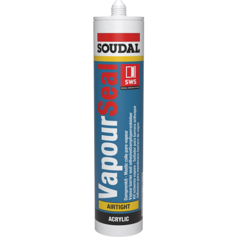 Soudal Vapourseal építőipari fóliaragasztó 310ml A VAPOURSEAL egy használatra kész, plaszto-elasztikus, egykomponensű akrildiszperziós bázisú tömítő-ragasztó, lég- és párazáró munkákhoz, mindenfajta fólia és szalag esetére, akár PE és PP ragasztáshoz i