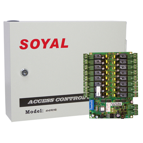 SOYAL 16 emeletes liftvezérlő A liftvezérlő főbb jellemzői A 16 relével szerelt modult vezérelheti akár önálló, akár hálózatos üzemmódban működő olvasókkal. Több emelet esetén a liftvezérlések egymáshoz fűzhetők. RS-485 kommunikációs port. 16 db C-NO-NC relé kimenet. Opcionális Ethernet csatlakozás (AR-727i modul szükséges). Beépített figyelő óra. 10-24 VDC tápellátás. Méretek: 180 x 231 x 44 mm. CE minősítés. RoHS tanúsítvány.