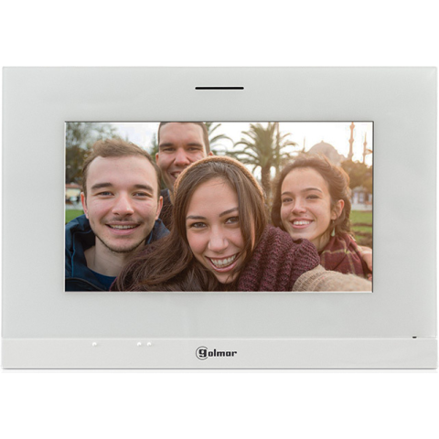 Golmar színes beltéri egység A beltéri egység főbb jellemzői 7" színes képernyő, kapacitív (érintésre aktív) funkció gombok. “G2+” kétvezetékes, polaritás független bekötés. Borítás: fehér ABS műanyag. Felületre szerelhető. Kitekintő funkció (kamera aktívállás becsengetés nélkül). "Orvos" és "ne zavarj" funkció. Belső kommunikáció a rendszer eszközei között. Személyre szabott csengőhangok. Akár 100 fénykép tárolása a belső