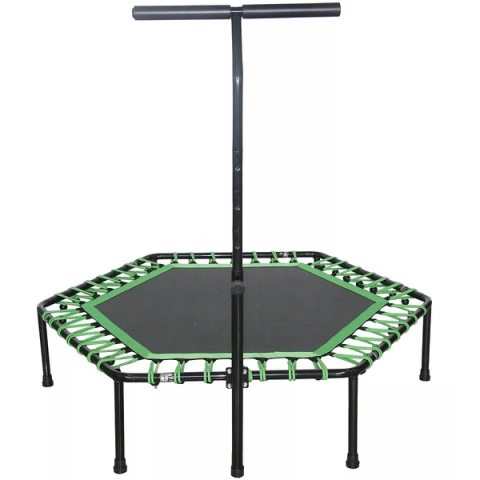 Rugó nélküli trambulin kapaszkodóval, fitnesz célra!Hatékony és szórakoztató cardio edzésforma, amely garantáltan megmozgatja az izmokat, valamint javítja a szív- és érrendszert és növeli a tüdőkapacitást és az állóképességet.Az ugrálófelületet 42 darab bungee zsinórral van rögzítve a vázhoz, ezáltal a trambulin különösencsendes és kényelmes ugrálás közben, nincsenek fémes zajok. A zsinórokat könnyedén el lehet fedni a dobozban található huzattal.A
