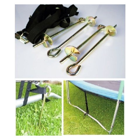 A trambulinrögzítő segítségével a trambulint megfelelően a földhöz rögzítheti. A rögzítő rendszer puha felületű rögzítéshez használható. A szett 4 db menetes rögzítőt (ezüst színben) és 4 db fekete színű feszítőszalagot tartalmaz.