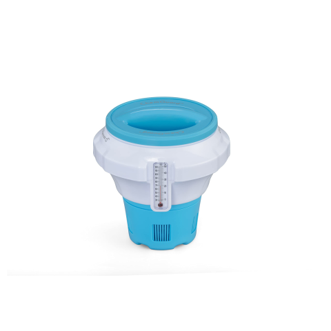 A Bestway Úszó vegyszeradagoló hőmérővel egy praktikus kiegészítő medencékhez, mely megoldást nyújt a vegyszerrel való érintkezésekhez, ugyanis az adagioló teteje, úgy van kialakítva, hogy azzal a klór vagy egyéb tablettákat kényelmesen és biztonságosan megtudjuk fogni, és bele tudjuk helyezni az adagolóba. A ChemGuard™ védőkesztyűvel ellátott Flowclear™ adagolóúszó praktikus és biztonságos módszert k