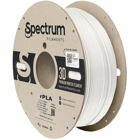 Filament – rPLA, 1,75 mm húrátmérő 0,03 mm tűréssel, 1 kg tömegű, 215 °C max. nyomtatási hőmérséklet, max. nyomtatási platform hőmérséklet 45 °C, ajánlott nyomtatási sebesség 30 mm/s - 100 mm/s A minőségi Spectrum PLA filament PLA anyagból készült és kezdőknek is jó választás. Fehér színben kapható. Ez a változat egy rPLA változat, amely újrahasznosított PLA-ból készül, így hozzájárul az öko