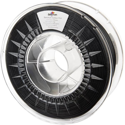 Filament – PLA anyagból Karbon, 1,75 mm húrátmérő 0,03 mm tűréssel, 1 kg tömegű, 220 °C max. nyomtatási hőmérséklet, max. nyomtatási platform hőmérséklet 45 °C, ajánlott nyomtatási sebesség 30 mm/s - 150 mm/s A remek Spectrum PLA filament PLA-ból készült, így a kezdők is értékelni fogják. Fekete színben kapható. Szénszálakat tartalmaz, amelyek szilárdságukról és merevségükről ismertek. Átmérője 1,75 mm 0,0