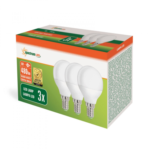 SpectrumLED LED kisgömb „izzó beltéri használatra IP20 védettségű 6W 230 V E14 műanyag Meleg fehér 480lm 77mm Márka: SpectrumLED; Teljesítmény (W): 6; Foglalat: E14; Szín és színhőmérséklet: 3000K meleg fehér; Fényáram: 480; Szórásszög: 160; Működtető