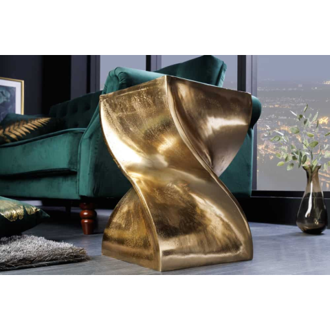 Design lerakóasztal Spin 45 cm arany aluminium A Spin lerakóasztal egy kézzel készített, egyedi darab, amely magas minőségű arany színű fém–aluminium ötvözetből készült. Különleges megjelenését az aszimmetrikus, homokórára emlékeztető form